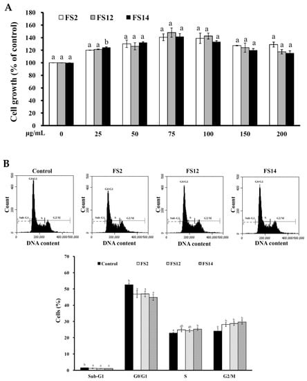 (A) Effects of FS2, FS12, and FS14 on cell growth of HaCaT cells. HaCaT cells were treated with different concentrations of FS2, FS12, or FS14, and the cell growth was measured by the MTT assay. The bar graph represents the three experiments and shows the percentage of cell growth for FS2, FS12, and FS14 at different concentrations. (B) Effects of FS2, FS12, and FS14 on cell cycle profiles of HaCaT cells. HaCaT cells were treated with FS2, FS12, and FS14 at a concentration of 75 μg/mL for 24 h, and cell cycle profiles were assessed. Bar graph summarizes three cell cytometric analyses showing the percentages of cells in the sub-G1, G0/G1, S, and G2/M phases of the cell cycle according to treatments. The data are represented as means ± SD (n = 3). In the same treatment or cell cycle stage, different letters (in a and b) upon bars indicate significantly different (p < 0.05).