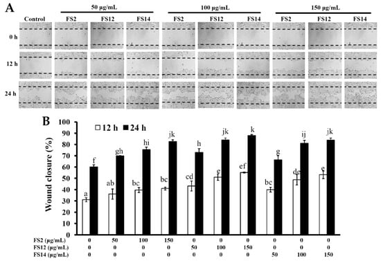 Effects of FS2, FS12, and FS14 on wound healing of HaCaT cells. (A) HaCaT cells were treated with different concentrations of FS2, FS12, and FS14, after incubation at 37 °C for 12 and 24 h, and the wound-healing activity was assessed. (B) The bar graph summarizes the three wound healing experiments and shows the percentage of wound closure for FS2, FS12, and FS14 at different concentrations and different time intervals. The data are represented as means ± SD (n = 3). Bar values having different letters (in a, b, c, d, e, f, g, h, i, j, and k) indicate significantly different (p < 0.05).