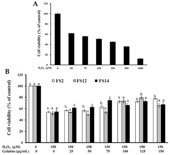 Oxidative protection of FS2, FS12, and FS14 in HaCaT cells. (A) HaCaT cells were treated with various concentrations of H2O2 for 24 h, and cell viability was assessed by the MTT assay. (B) HaCaT cells were pre-incubated with FS2, FS12, or FS14 (0 to 150 μg/mL) for 24 h, followed by exposure to 150 μM H2O2 for 24 h, and cell viability was assessed by the MTT assay. The data are represented as means ± SD (n = 3). In the same treatment concentration, different letters (in a, b, and c) upon bars indicate significantly different (p < 0.05).