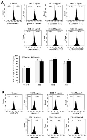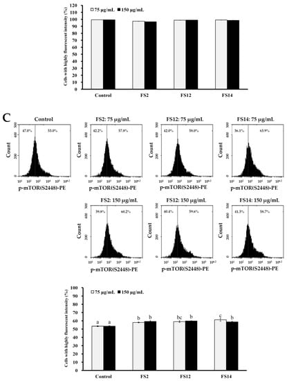 Effects of various concentrations (75 and 150 μg/mL) of FS2, FS12, and FS14 on the expressions of p-Akt, Akt1, and p-mTOR in HaCaT cells: (A) HaCaT cells were pretreated with FS2, FS12, or FS14 at a concentration of 75 or 150 μg/mL for 6 h, and fluorescence histograms of immunolabeled p-Akt were assessed. Bar graph summarized three cell cytometric analyses showing the percentages of cells with highly fluorescent intensity according to treatments. (B) HaCaT cells were pretreated with FS2, FS12, or FS14 at a concentration of 75 or 150 μg/mL for 6 h, and fluorescence histograms of immunolabeled Akt1 were assessed. The bar graph summarizes three cell cytometric analyses showing the percentages of cells with highly fluorescent intensity according to treatments. (C) HaCaT cells were pretreated with FS2, FS12, or FS14 at a concentration of 75 or 150 μg/mL for 6 h, and fluorescence histograms of immunolabeled p-mTOR were assessed. The bar graph summarizes three cell cytometric analyses showing the percentages of cells with highly fluorescent intensity according to treatments. The data are represented as means ± SD (n = 3). Different letters (in a, b, and c) upon bars indicate significantly different (p < 0.05).