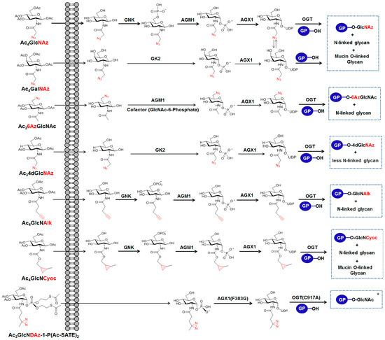Ac4GlcNAz is the first azidosugar that has been shown to be converted metabolically to the nucleotide sugar uridine diphosphatidyl GlcNAc analog UDP-GlcNAz. Then, UDP-GlcNAz serves as substrates for OGT allowing its incorporation into glycoprotein substrates (Figure 2 [10]). Zhao et al. used metabolic labeling with Ac4GlcNAz and the Staudinger ligation reaction for a global O-GlcNAc proteomic study and identified 199 putative O-GlcNAcylated proteins with a wide range of functions, suggesting that O-GlcNAc is involved in regulating multiple cellular pathways [17]. In addition to the Staudinger ligation, copper-catalyzed alkyne−azide cycloaddition (CuAAC) reaction between an alkyne-functionalized agarose resin and whole-cell lysates from Ac4GlcNAz-fed HEK293 cells was also used to identify approximately 1500 putative O-GlcNAcylated proteins as well as 185 GlcNAcylation sites [18]. Natural UDP-GlcNAc is used for GlcNAc incorporation not only into O-GlcNAc proteins, but also into the N-linked glycans and mucin-type O-linked oligosaccharides. In addition, the interconversion of UDP-GlcNAc to UDP-GalNAc can lead to the incorporation of GlcNAc at the core of mucin-type O-linked glycans. Similarly, GlcNAz is incorporated metabolically into O-GlcNAc proteins, but also N-linked and/or mucin-type O-linked glycans are labeled.