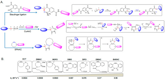 Bioorthogonal reactions with azide (A); and a series of cycoalkyne reagents developed for SPAAC with corresponding k2 values for the 1,3-dipolar cycloaddition with benzyl azide (B). Simplified mechanistic views of each reaction (Staudinger ligation in the upper, CuAAC in the middle, SPAAC in the bottom in (A)) are described in the box.