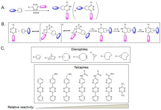 Tetrazine ligation of alkene-functionalized biomolecules through iEDDA: Schematic representation of: iEDDA (A); its mechanism (B); and several dienophiles and tetrazine derivatives with their relative reactivities (C).