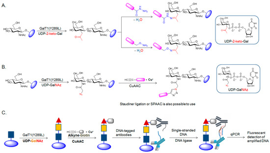 Schematic description of chemoenzymatic tagging of ketone- (A) or azide-functionality (B) followed by its bioorthogonal ligations to probe the O-GlcNAcylated proteins, and “Glyco-seek” strategy (C).