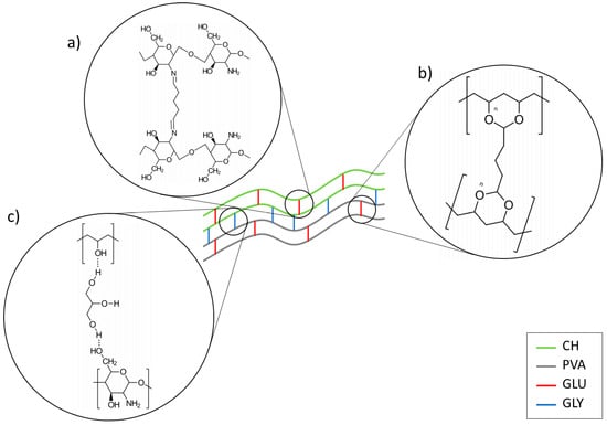 Schematic representation of interactions between CH, PVA, GLU, and GLY. (a) CH crosslinked by GLU. (b) PVA crosslinked by GLU. (c) Hydrogen bonding between CH and PVA with GLY.