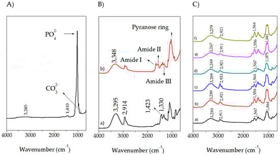 Collection of the obtained FTIR spectra. (A) Hydroxyapatite; (B) (a) PVA and (b) CH; (C) Prepared scaffolds (a) CH:PVA 1:1 GLU-GLY; (b) CH:PVA 1:1; (c) CH:PVA 1:3 GLU-GLY; (d) CH:PVA 1:3; (e) CH:PVA 3:1 GLU-GLY; (f) CH:PVA 3:1.