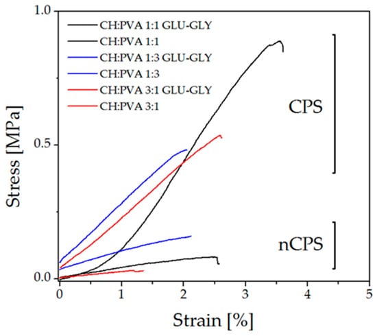 Young’s Modulus (E), tensile strength (TS) and yield strength (YS) were chosen for evaluating how the material behaves under mechanical loads and the results are reported in Table 2. The first remarkable feature of the studied samples is that differences in Young’s Modulus are caused by the presence of the crosslinker and the plasticizer. As can be noticed, CPS display notably higher values than nCPS because GLU is chemically joined to both polymers reducing chain mobility. Nonetheless, as it was mentioned above (see swelling and solubility analysis), CH amine groups are more reactive to GLU than PVA, and therefore, the blend exhibits CH-like features. Indeed, by bonding polymer chains with GLU through Schiff bases and acetal bonds, the material improves its toughness. Therefore, CPS require more energy to be elongated and, ultimately, break. This behavior can be seen in Figure 3 where samples at >1% strain grouped in separate zones of the graph; CPS are found above nCPS along the Y-axis, enclosing a larger area under the curve than nCPS.