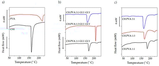 Thermograms for pure components and prepared scaffolds are shown in Figure 4. Glass transition temperature (Tg) and melting point (Tm) (Table 3) for PVA are located at 72 °C and 218 °C respectively, results that have been reported for other authors [,,]. CH, on the other hand, exhibits an endothermic transition between 100–120 °C which is attributed to evaporation of residual water []. A sharp peak centered at 161 °C is not a manifestation of Tm since a recrystallization peak did not appear neither in the second cooling nor in the second heating scan. Therefore, the peak presumably results from the dissociation process of interchain hydrogen bonding [].