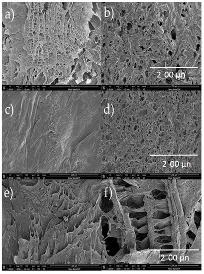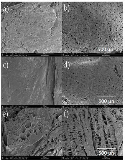 Surface SEM images for CPS (left) and nCPS (right) at 250×. (a) CH:PVA 1:1 GLU-GLY; (b) CH:PVA 1:1; (c) CH:PVA 1:3 GLU-GLY; (d) CH:PVA 1:3; (e) CH:PVA 3:1 GLU-GLY; (f) CH:PVA 3:1.