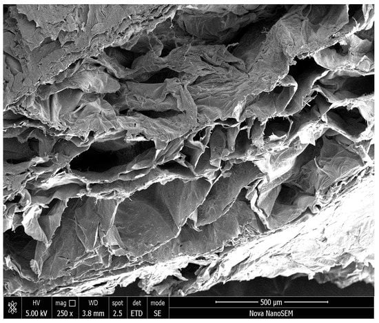 Despite all the morphological features exhibited by CPS and nCPS, CH:PVA 3:1 GLU-GLU (Figure 7) seems to be adequate for bone tissue engineering. The data obtained during the evaluation of pore size revealed uniform pore formation with diameters ranging from 142 to 519 µm, a range that has been described as optimal for bone tissue regeneration [] and the pore structure obtained is suitable for bone tissue engineering by exhibiting a homogeneous macro-porous network with open pores and some interconnectivity. Such hierarchical structure has potential application for future bone tissue in-growth, nutrient delivery and vascularization [].
