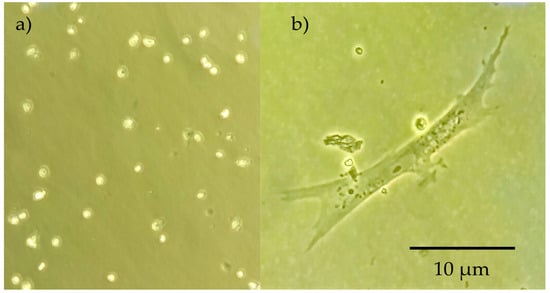 Cell culture was performed in triplicate for all the prepared scaffold during 17 days, and cell differentiation was evaluated through morphologic analysis. Initial conditions of trypsinized osteoblastic cells are shown in Figure 8. After three days of culture, a higher degree of differentiated cells were present in CPS, exhibiting the formation of osteocytic canaliculi (Figure 8b) which suggest proper cell signaling through osteocyte gap junctions []. Furthermore, the characteristic star-like morphology for osteocyte are visible in the image, suggesting that the process from osteoblast to osteocyte has been carried out. These cytoplasmic projections allow to the cell to communicate with surrounding osteocytes using gap join []. Proliferation continued during the first 5 days of the experiment. Later, it was not possible to evaluate it, as cells migrated inside the scaffolds and for observation it was needed to destroy the scaffold. Therefore, cell activity was evaluated through colorimetric observations of culture media and it was constant until 7 days of culture.