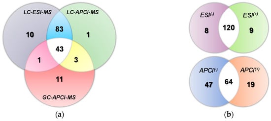Venn diagrams showing total and overlapping numbers of identified compounds achieved with each platform and MS polarity. (a) LC-ESI-MS vs. LC-APCI-MS vs. GC-APCI-MS (combining together both ionization modes in LC-MS experiments); and (b) positive (+) vs. negative (−) polarity in LC-ESI-MS and LC-APCI-MS platforms.