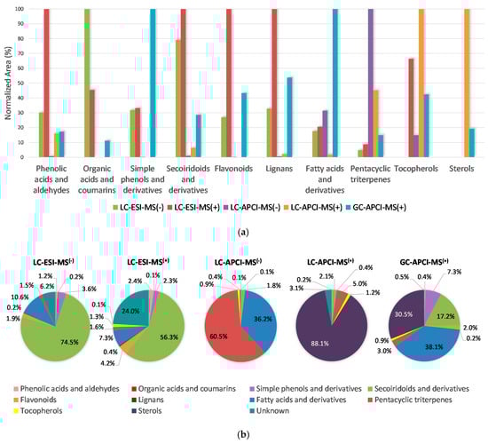 Figure 2a displays the normalized peak areas achieved for each chemical class with the five evaluated approaches (LC-ESI-MS (−/+), LC-APCI-MS (−/+) and GC-APCI-MS (+)). To facilitate the comparison, the highest area value (sum of all the compounds belonging to each group described in Section 2.1) was considered as 100, and the obtained areas with the rest of the tested platforms were expressed as a percentage of that value. It can be seen that the LC-ESI-MS platform, when working in positive ionization mode, produced the highest ionization rate for phenolic acids and aldehydes, secoiridoids and derivatives, flavonoids and lignans. The LC-ESI-MS methodology in negative polarity was the most appropriate one to detect the group of organic acids and coumarins, although it also showed relatively good efficiency when detecting secoiridoids and related substances. LC-ESI-MS (−) was also the second option to ionize phenolic acids and aldehydes with a suitable degree of effectiveness, and the third one (with very similar efficacy if compared with LC-ESI-MS (+)) for simple phenols and derivatives. The ESI interface (in any of both, positive or negative, polarities) was not useful for the determination of sterols. The LC-APCI-MS coupling used in negative ionization mode gave the best ionization rate for pentacyclic triterpenes (even though the alcohols were not ionizable in MS (−)), while, in positive polarity, it was the best option for tocopherols and sterols detection. As expected, LC-APCI conjunction resulted to be inadvisable for the detection of the most polar compounds. The GC-APCI-MS method was the best option for simple phenols and fatty acids-related analytes. It also gave good results for the rest of the considered chemical classes (in particular for lignans, tocopherols and sterols (if compared with the other approaches)), except for the previously mentioned fact that it was not possible to determine glycosylated compounds by means of this coupling (hence, the lower number of annotated metabolites in this platform). That means that the respective values shown in Figure 2 regarding the GC-APCI-MS platform do just consider aglycone forms.