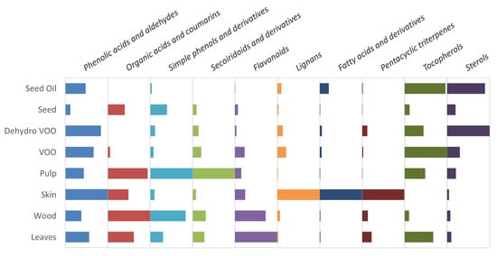 With regard to simple phenols, the glycosidic forms were mostly found in olive tissues, since they are generally hydrolyzed during oil extraction (for example, by the β-glucosidase action [8]). VOO was the richest matrix in terms of 3,4-dihydroxyphenylglycol. On the contrary, if compared with the oil obtained from stoned and dehydrated olives, the oil produced by the two-phase extraction method presented a reduced amount of the other two phenyl alcohols (tyrosol and hydroxytyrosol) and the acetylated derivative of hydroxytyrosol, but a higher content of the oxidized one. In addition, VOO was richer in terms of aglycones of oleuropein and ligstroside derivatives and had lower concentration of elenolic acid derivatives than the oil obtained from stoned and dehydrated olives; this can be seen in detail in Figure S3. It could suggest that either the thermal process involved in the dehydration of the stoned fruits is breaking down the secoiridoids into their degradation products (phenolic alcohols, elenolic acid, and derivatives) [8], or that the absence of water during the oil extraction is detrimental to the transfer of secoiridoids from the pulp to the oily phase. Figure S3 also shows how the glycosylated secoiridoids were more abundant in tissues than in the oils for the same reason as for the glycosylated simple phenols. Skin and seeds were the poorest olive tissues in terms of secoiridoids, being nuzhenide the most prevalent secoiridoid found in the latter one, as previously reported by different authors [51,52]. Glycosylated flavonoids were predominantly distributed between leaves and stems. The aglycones were also present in olive oils, more abundantly in VOO. Seeds and seed oil were the poorest matrices in terms of this chemical class, but they contained noticeable amounts of lignans, seed oil being the richest matrix regarding acetoxypinoresinol. Olive fruit skin was the matrix with the highest content of the other three evaluated lignans (syringaresinol, pinoresinol, and hydroxypinoresinol).
