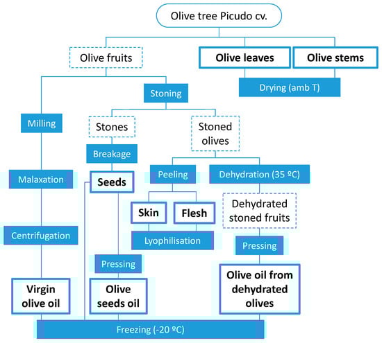 Sampling of olive fruits, leaves and stems, was performed on the same Picudo cv. olive tree mucho grown in Castillo de Locubín (Jaén, Spain (at approximately 750 m above sea level)) in January 2017. The olive tree cultivar was declared by the producer and had been previously certified. In total, eight different samples (tissues and oils) were analyzed in this study. Leaves and stems were dried at ambient temperature and stored in a fresh dark place. A portion of 5 kg of fresh fruits was processed by means of an Abencor® laboratory oil mill (MC2 Ingeniería y Sistemas, Seville, Spain) to obtain VOO at laboratory scale by the conventional two-phase process, which involves three steps: (i) crushing of entire fruits, (ii) malaxation of the paste and (iii) centrifugation for oil separation. Official IOC determinations were carried out to confirm the belonging of the oil to VOO category. The rest of the fruits were manually deconstructed to obtain different tissues and oils. Firstly, fruits were stoned and the obtained pits were broken with a hammer to extract the olive seed contained inside. Next, half of the stoned fruits were peeled to obtain olive skin and pulp separately, which were straightaway frozen and freeze-dried. The other half of the stoned fruits were dried at 50 °C in an oven until constant weight. Olive seeds and dehydrated stoned fruits were further processed by mechanical pressing to obtain two new kinds of oils. Figure 4 shows a diagram of the procedure followed to prepare the samples.