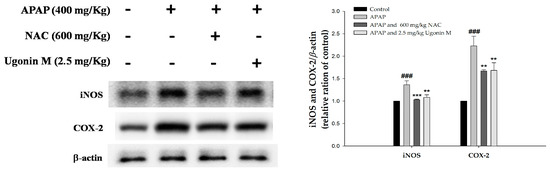2.7. Effects of Ugonin M on Inducible Nitric Oxide Synthase (iNOS) and Cyclooxygenase-2 (COX-2) Protein Expression in Liver Tissue