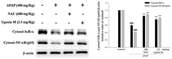 2.8. Effects of Ugonin M on Activities of Nuclear Factor-Kappa B (NF-κB) in Liver Tissue