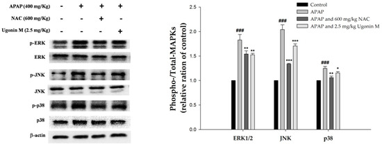 - Liao, C.C.; Day, Y.J.; Lee, H.C.; Liou, J.T.; Chou, A.H.; Liu, F.C. ERK signaling pathway plays a key role in baicalin protection against acetaminophen-induced liver injury. Am. J. Chin. Med. 2017, 45, 105–121. [Google Scholar] [CrossRef] [PubMed]