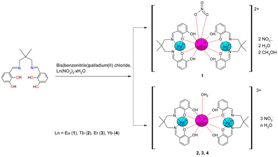 - Kaczmarek, M.T.; Kubicki, M.; Hnatejko, Z. Two Types of Lanthanide Schiff Base Complexes: Synthesis, Structure and Spectroscopic Studies. Polyhedron 2015, 102, 224–232. [Google Scholar] [CrossRef]