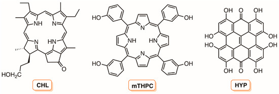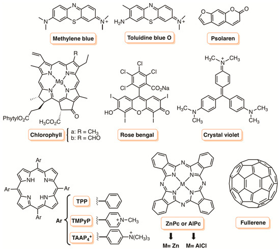 In the last few years, the development and biological assessment of new molecules for PDI has grown considerably. Some classes of PSs, such as phenothiazinium dyes (e.g., methylene blue and toluidine blue O), psoralens, perylenequinonoid pigments (e.g., hypocrellin), natural and synthetic based tetrapyrrolic macrocycles (e.g., chlorophylls, bacteriochlorophylls, porphyrins, corroles, and phthalocyanines), and fullerenes have been effectively tested, demonstrating themselves to be good antimicrobial agents (Figure 2) [25,26,27,28,29,30,31]. For instance, the studies showed that the photoinactivation of Gram-(+) and Gram-(−) bacterial strains is highly dependent on the PS structure. In general, neutral, cationic, or anionic PS can easily inactivate Gram-(+) bacteria, but an effective photoinactivation of Gram-(−) bacteria, without the presence of membrane disrupting agents, requires the presence of a cationic PS. This inactivation difference is associated with the cell wall constitution. Most Gram-(+) bacteria have a single cell wall constituted by peptidoglycan, with lipoteichoic and teichuronic acids, which display a relatively high degree of porosity, while the Gram-(−) bacteria, other than the peptidoglycan layer, possess an additional highly organized outer membrane composed of lipopolysaccharides that are strongly negatively charged, phospholipids, lipoproteins, and proteins [31] (Figure 3).