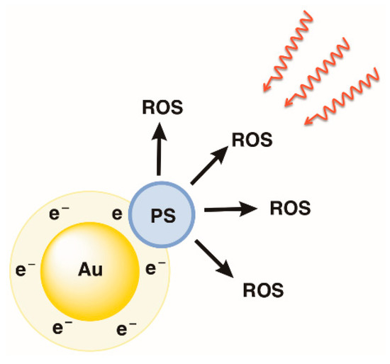 Among all the MNPs, gold NPs (AuNPs) have received particular attention due to their distinctive properties that can make them suitable for several applications such as labeling, delivery, heating, and sensing [51,52,53]. Recently, AuNPs also earned significant attention in the photodynamic approach due to their properties, such as, biocompatibility, size, unique surface, and also optical properties [54,55,56]. Furthermore, the conjugation of PSs on the surface of AuNPs may increase the PDI efficacy as a result of the localized surface plasmon resonance (SPR) of AuNPs upon light exposure. This situation will then lead to a PS-efficient activation (an increase in the PS excitation rate) and an improvement in the ROS production (Figure 4) [56,57].