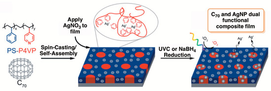 Schematic representation of the procedure to prepare PS-P4VP multifunctional antimicrobial films containing C70 and in situ prepared AgNPs. Reproduced from Reference [80] with permission from the American Chemical Society.