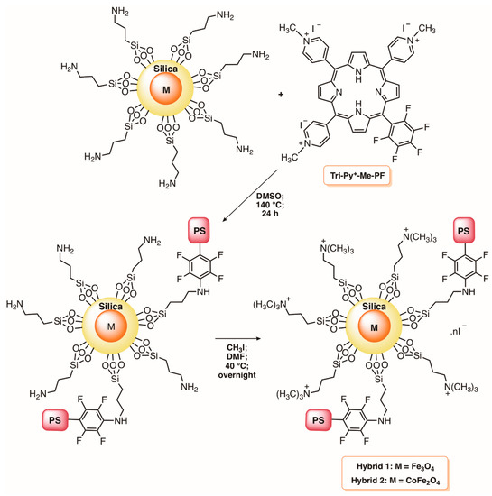 In 2010, considering the remarkable photodynamic efficiency of 5,10,15-tris(1-methylpyridinium-4-yl)-20-(pentafluorophenyl)porphyrin tri-iodide (Tri-Py+-Me-PF) towards a wide range of microorganisms under mild conditions [100], our group reported its immobilization in cationized silica-coated magnetic nanoparticles of Fe3O4 (Figure 10) [35]. The multi-charged nanomagnet Hybrid 1, based on Tri-Py+-Me-PF, was effective in the photoinactivation of both Gram-(+) and Gram-(−) fecal bacteria, causing a 5 log decrease for E. faecalis and E. coli at 20 μM of Tri-Py+-Me-PF when using white light irradiation (64.8 J cm−2). The full inactivation of the T4-like bacteriophage (≈7 log of inactivation) in the presence of the same hybrid also confirmed its efficacy as an antiviral agent [35]. The capability of this hybrid material to be recycled and reused, and also the potential of the analogue with a CoFe2O4 core (Hybrid 2), were posteriorly evaluated using water contaminated with the Gram-(−) bacterium Allivibrio fischeri (Figure 10) [99]. The results obtained demonstrate that both hybrids were effective in the bacterial inactivation with accumulative values after a six-cycle reuse of ≈42 log CFU mL−1 in 21.5 h and ≈38 log CFU mL−1 in 27 h, respectively, for Hybrids 1 and 2. It was commented that the efficacy of the recycling process could be improved if bigger active particles were used to be completely retained by a magnetic field [99].