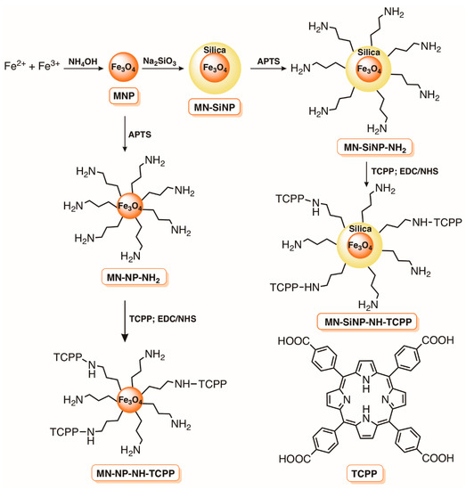 Durantini and co-workers [98] also selected magnetic SiNP of Fe3O4 functionalized with aminopropyl groups to covalently link the 5,10,15,20-tetrakis(4-carboxyphenyl)porphyrin (TCPP) (Figure 11) in order to evaluate their potential as an antimicrobial material. In the material referred to as MN-SiNP-NH-TCPP, the magnetic core was previously coated with silica before functionalization with (3-aminopropyl)trimethoxysilane (APTS), while in the other material, designed as MN-NP-NH-TCPP, the grafting of the amino functionalities was performed directly on the magnetic core. In both cases, the conjugation of porphyrin derivative in the magnetic NP was successful attained via carbodiimide activation of the carboxylic groups (Figure 11). The biological studies revealed that both materials were effective against S. aureus, E. coli, and C. albicans in the first cycle of inactivation but the efficiency of MN-NP-NH-TCPP rapidly decreased in further cycles. A different situation was observed with the magnetic coated material MN-SiNP-NH-TCPP; the efficient decrease of 2.5 log for S. aureus and C. albicans and 3.0 log for E. coli after 30 min of irradiation (90 mW cm−2) at 3.0 µM of TCPP observed in the first inactivation cycle was maintained in the following two cycles. In this study, it was proved that 1O2 was the main cytotoxic species involved in the photodynamic process and the presence of the silica coating layer in the MN-SiNP-NH-TCPP was important to avoid the magnetic core oxidation and decomposition, and to prevent aggregation [98].
