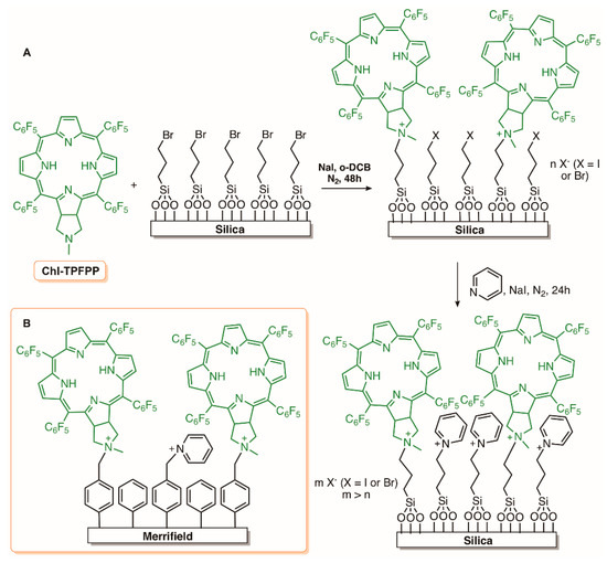 (A) Schematic representation of the immobilization of a pyrrolidine-fused chlorin derivative on a modified silica gel support with further cationization with pyridine units. (B) Diagram of the pyrrolidine-fused chlorin derivative immobilized on a cationized Merrifield resin (adapted from Reference [101]).