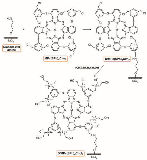Kuznetsova et al. [102] selected the commercially available aminopropyl silica to immobilize the zinc and aluminum complexes of phthalocyanines tetrasubstituted at non-peripheral positions with chloromethylated thiophenyl groups as potential photobactericidal materials (Figure 13). The grafting of the phthalocyanines in silica was performed in DMF at ≈85 °C and further reaction with N,N-dimethylaminoethanol gave rise to positively charged D/MPc(SPh)4Chol7. Sodium taurinate was selected to obtain negatively charged phthalocyanines. The photodynamic efficiency of the different materials was evaluated using a bioluminescent E. coli and the biological assays were performed under white light (75 mW cm−3) at a PS concentration of 20 µM. The results showed that the aluminum positively charged phthalocyanine D/AlPc(SPh)4Chol7 had the highest bacterial activity (bioluminescence reduction > 80%), followed by neutral D/AlPc(SPh)4Clm7 (80%), and finally by the negatively charged taurinate phthalocyanines (bioluminescence reduction ≈60%). The authors commented that a more effective interaction between the Gram-(−) bacteria and the positively charged PS was probably responsible for this fact. The dependence observed on the cationic D/ZnPc(SPh)4Chol7 to generate 1O2 with the load in the support (less PS load means better efficiency) was not reflected in its photodynamic action, since a similar bioluminescence reduction of ≈70% was found for materials with different zinc(II) phthalocyanine loads [102].