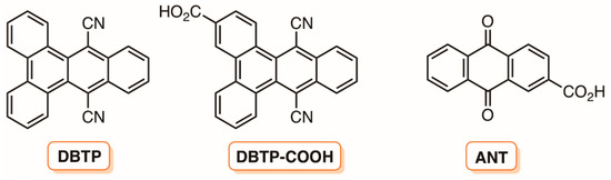 Lacombe and their co-workers [104] also reported the synthesis and the disinfection efficiency towards E. coli of silica-based materials covalently linked to other non-porphyrinic PSs as 9,10-anthraquinone-4-carboxylic acid (ANT) and 9,14-dicyanobenzo[b]triphenylene-3-carboxylic acid (DBTP-COOH) (Figure 15). The immobilization of ANT involved a preliminary functionalization with (3-aminopropyl)triethoxysilane followed by the grafting in commercial silica beads by reflux in toluene affording SiO2-ANT. The DBTP was grafted directly in a commercially available amino-functionalized silica powder giving rise to the material designed as SiNH2-DBTP. Although a slow but effective inactivation of E. coli (7 log after 360 min of irradiation) was observed with pure silica (without any PS) under UV-A (3.85 mW cm−2, 365 nm), a noticeably improvement was detected when the irradiation took place in the presence of the same amount (2.5 g L−1) of SiO2-ANT and to a lesser extent with SiNH2-DBTP at the same concentration. After exposure to UV-A for 110 min and 270 min, respectively, SiO2-ANT and SiNH2-DBTP were able to decrease the bacterial concentration to undetectable levels (decreases of > 6.0 log). It was also demonstrated that the mode of PS introduction in silica and the amount of silica in the suspension were fundamental parameters for the material efficiency [104].