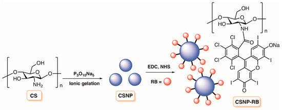 As an extension of the previous work, the same group [121] developed NPs based on polymeric chitosan covalently linked to Rose Bengal (CSNP-RB) (Figure 20) and evaluated their efficacy in reducing the viability of E. faecalis biofilms to disrupt biofilm structure and their ability to stabilize the dentin-collagen structural integrity. The chitosan nanoparticles (CSNP) were prepared by treating chitosan, previously dissolved in acetic acid, with a solution of sodium hydroxide in order to increase the pH to ≈5 and then with sodium tripolyphosphate under stirring. The NPs were obtained by centrifugation at 20,000 rpm for 30 min followed by the conventional work-up. The conjugation of CSNP to RB acid group was performed in the presence of EDC and N-hydroxysuccinimide (NHS), as previously described. The study showed that the CSNP-RB was also less toxic to fibroblasts and had significant antibacterial activity (reduction > 8 log) even in the presence of bovine serum albumin. The authors explained that CSNP-RB exerted an antibacterial mechanism by adhering to a bacterial cell surface, permeabilizing the membrane and lysing the cells subsequent to photodynamic treatment. Incorporation of CSNP-RB and photocrosslinking significantly improved resistance to degradation and the mechanical strength of dentin-collagen.