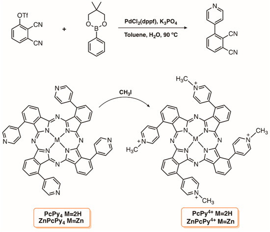 The cationic phthalocyanines PcPy4+ and ZnPcPy4+ with four pyridyl substituents linked via a direct C-C bond to the α-phthalo-positions (Figure 22) were also considered in the design of photoactive antimicrobial surface based on cellulose [126]. The synthetic access to those derivatives required the previous preparation of the pyridine phthalonitrile from the pyridine boronate ester and the triflate phthalonitrile (Figure 22). Then, tetramerization under conventional conditions to afford the neutral precursors PcPy4 and ZnPcPy4 followed by methylation with iodomethane in DMF gave rise to the desired cationic salts (PcPy4+ and ZnPcPy4+). The antimicrobial surfaces were prepared by soaking 3.5 × 3.5 cm filter papers (Whatman 1) in aqueous solutions containing the neutral and the cationic dyes at different concentrations (range from 0.008 to 0.08 mg cm−2). The photodynamic antimicrobial efficacy of the dyed filter paper samples using bioluminescent E coli and Acinetobacter baylyi ADP1 strains allowed for the selection of the zinc complex ZnPcPy4+ as the best PS; the PDI experiments were performed for 60 min using white light (wavelength 485–750 nm) of intensity 18 mW cm−2. The antimicrobial activity of the filter paper dyed with ZnPcPy4+ achieved a reduction of 2.7 log CFU against E. coli and of 3.4 log against A. baylyi.