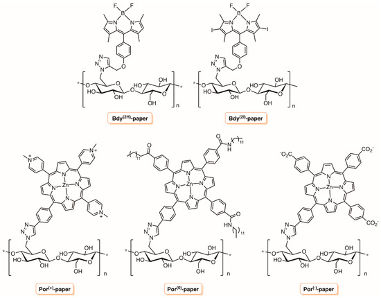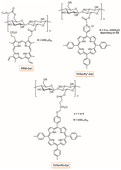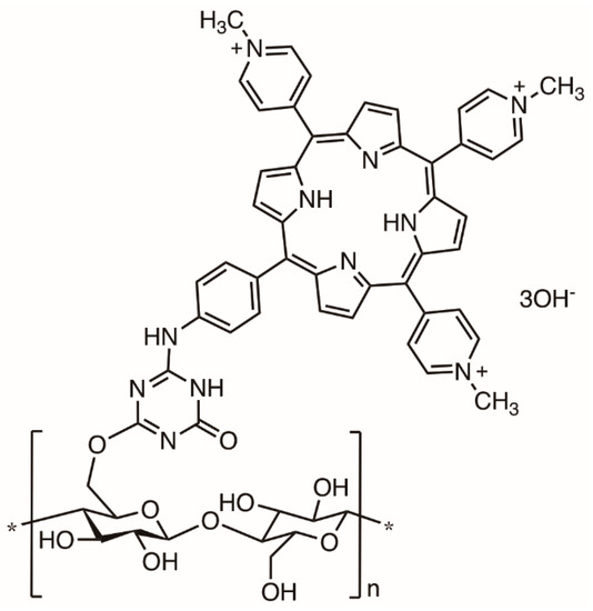 Considering that cellulose could be an excellent material to develop germicidal surfaces at low cost, in 1994, Bonnett and Galia [124] reported the photobactericidal properties of “cellophane” films (regenerated cellulose) impregnated with the cationic porphyrins 5,10,15,20-tetrakis(1-methylpyridinium-4-yl)porphyrin tetra-tosylate (TMPyP) and with 5,10,15,20-tetrakis(N,N,N-trimethylanilinium-4-yl)porphyrin tetra-tosylate (TAAP4+) (Figure 2). The impregnation time required was performed by maintaining commercially available cellophane sheets of 50 µm thickness in contact with the porphyrins dissolved in aqueous solution or aqueous methanol solution at about 50 °C. The amount of absorbed porphyrin was estimated by UV-Vis spectroscopy after washing thoroughly. The authors verified that the films containing TMPyP, after exposure to a 1500 W xenon lamp for 50 h, retained their flexibility and strength and were not photobleached (although some photochemical changes occurred such as a slightly opacity). No bacterial growth was verified when the films impregnated with TMPyP (18 µg cm−2) were maintained in contact with bacterial inoculum of S. aureus, Proteus vulgaris and E. coli for 24 h under visible light (fluorescent lamp) irradiation. Similar photobactericidal results were reported with the TAAP4+ only towards S. aureus. The results with P. aeruginosa strain were not conclusive. The authors highlighted that the attempts to impregnate the cellophane films with anionic porphyrins were not successful.