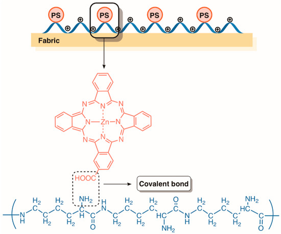 In 2016, Rassa and co-workers [125] also selected the tetracationic porphyrin TAPP4+ (Figure 2) and the corresponding Zn(II) complex to prepare cellulosic fabrics for antimicrobial applications. The impregnation was performed by soaking a 100% cellulosic fabric, pretreated with an aqueous solution of Na2CO3 at 50 °C for 30 min, with solutions of the porphyrins in PBS. After 30 min at 50 °C, the unbound porphyrin was thoroughly washed, and the molar grafting ratio was calculated using UV-Vis. The basic pretreatment was important to activate the cellulose hydroxyl group in order to promote electrostatic interactions with the cationic PS. The authors noted that the grafting yield was dependent on the initial concentration of the PS and its presence in the cellulosic fabrics was confirmed by spectroscopic techniques. The antimicrobial activity of the new materials was tested under visible light irradiation (100 W tungsten lamp with an average intensity of ≈0.36 mW cm−2) towards S. aureus, P. aeruginosa, and E. coli. The results showed that the irradiation period, the PS concentration, and the bacterial strain were important factors to be taken in account. S. aureus was fully inactivated with both prepared cellulose fabrics at a PS concentration of 100 µM after 30 min of irradiation, while for P. aeruginosa, at the same PS concentration, the full inactivation was only attained in the presence of the ZnTAPP4+ after 90 min of irradiation. The worse efficiency of the materials towards E. coli (58.5% for TAPP4+ and 30% for ZnTAPP4+) at the same concentration and after 90 min of irradiation was explained by considering the more complex composition of this Gram-(-) cell wall, that seems to protect this strain more effectively from extracellular 1O2.
