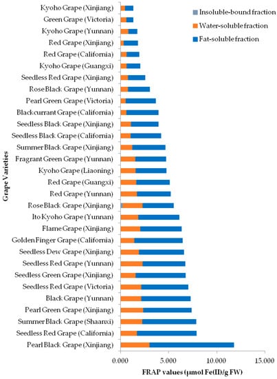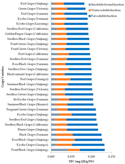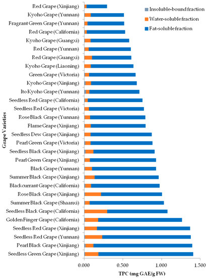 The TPC values ranged from 0.262 to 1.277 milligram gallic acid equivalents (mg GAE)/g FW for the lipophilic fractions, 0.026 to 0.292 mg GAE/g FW for the hydrophilic fractions, 0.004 to 0.026 mg GAE/g FW for the insoluble-bound fractions, and 0.294 to 1.407 mg GAE/g FW for total, respectively (Figure 4). The results of TPC values were consistent with previous studies [25,26]. A study showed the TPC values were 642 ± 9.2 and 1028 ± 14.9 mg GAE/kg fresh material for two grape varieties [25], while in another study, the TPC of pulps from 8 Muscadine grape cultivars were in the range of 0.3–1.2 mg GAE/g FW [26]. The variability of TPC values could be attributed to the genetic and environmental factors of the growing location such as climate, soil composition, temperature, and ripening stage [27]. Another study also suggested that significant varietal differences were observed in phenolic contents among table grape cultivars [18]. The TPC values were in a decreasing order: lipophilic fraction > hydrophilic fraction > insoluble-bound fraction (Table 1). These results might be due to the different polarities of solvents that were used to extract phytochemicals. The weak polarity of tetrahydrofuran made the grape cell membranes easy to dissolve and more permeable; as such higher concentrations of polyphenols were released into the solvents [28]. The grapes with the highest-five total TPC values were Seedless Green Grape (Xinjiang, 1.407 mg GAE/g FW) > Pearl Black Grape (Xinjiang, 1.396 mg GAE/g FW) > Seedless Red Grape (Yunnan, 1.377 mg GAE/g FW) > Seedless Red Grape (Xinjiang, 1.367 mg GAE/g FW) > Golden Finger Grape (California, 1.264 mg GAE/g FW) in a decreasing order.