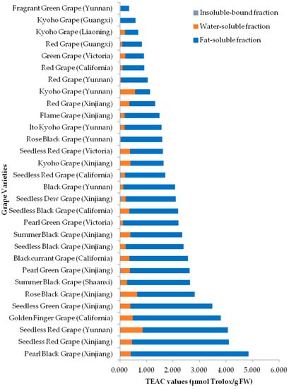 The TEAC values were in the range of 0.294–4.425 μmol Trolox/g FW for lipophilic fractions, 0.001–0.833 μmol Trolox/g FW for hydrophilic fractions, 0.007–0.064 μmol Trolox/g FW for insoluble-bound fractions, and 0.339–4.839 μmol Trolox/g FW for total, respectively (Figure 2). The TEAC values of 3 fractions were lipophilic fraction > hydrophilic fraction ≈ insoluble-bound fraction (Table 2), indicating that the antioxidants in grape pulps responsible for scavenging free radicals were mostly distributed in lipophilic fractions, followed by hydrophilic and insoluble-bound fractions. The grapes with top-five total TEAC values were Pearl Black Grape (Xinjiang, 4.839 μmol Trolox/g FW) > Seedless Red Grape (Xinjiang, 4.100 μmol Trolox/g FW) > Seedless Red Grape (Yunnan, 4.061 μmol Trolox/g FW) > Golden Finger Grape (California, 3.794 μmol Trolox/g FW) > Seedless Green Grape (Xinjiang, 3.478 μmol Trolox/g FW) in a decreasing order.