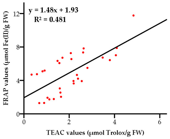 The FRAP and TEAC values showed a moderate positive linear correlation (R2 = 0.481, with a level of significance of 95%) (Figure 3). The results indicated that the compounds responsible for reducing oxidants were not completely consistent with those scavenging free radicals in grape pulps. It can also be concluded that the antioxidant capacities of grape pulps could not be characterized by a single assay of FRAP or TEAC.