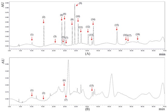 Chromatograms of the standard compounds (A) and grape pulp (B) under 276 nm. The numbers in brackets refer to the compounds: gallic acid (1); protocatechuic acid (2); gallo catechin (3); chlorogenic acid (4); cyanidin-3-glucoside (5); caffeic acid (6); epicatechin (7); catechin gallate (8); p-coumaric acid (9); ferulaic acid (10); melatonin (11); 2-hydroxycinnamic acid (12); rutin (13); resveratrol (14); daidzein (15); equol (16); quercetin (17); genistein (18).