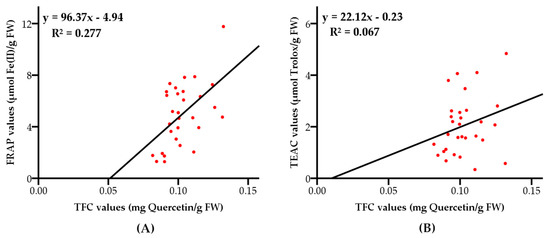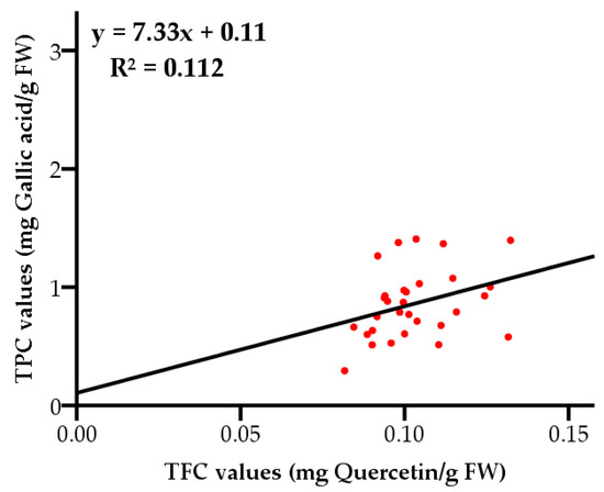 The total phenolic contents and total flavonoid contents showed a weak correlation (R2 = 0.112, with a level of significance of 95%) as displayed in Figure 7, indicating flavonoids were not the main phenolic compounds in grape pulps. The results were different from a previous study, in which the TFC values of three wine grapes were significantly correlated with TPC values [31]. The inconsistency might be a consequence of geographical location and varietal differences.