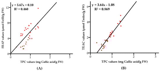 The correlation analysis demonstrated that the level of antioxidant capacities were dependent on total phenolic contents. The correlation coefficient (R2) between FRAP values and total phenolic contents of the grape pulps was 0.460, with a level of significance of 95%, as shown in Figure 8A. The results indicated that phenolic compounds in grape pulps were moderately related to the capacities of reducing oxidants, which might because of antioxidant vitamins and other antioxidant phytochemicals, and/or synergism among them and polyphenols contributing to FRAP values [32]. The antioxidant capacities investigated by TEAC assay showed highly positive correlation (R2 = 0.869, with a level of significance of 95%) with total phenolic contents as shown in Figure 8B, indicating phenolic compounds could be the main components responsible for scavenging free radicals. In a previous study, Chichá (Sterculia striata) nuts exhibited strong correlations between total phenolic content and antioxidant activities determined by TEAC and FRAP assays [33]. However, no correlation between the TEAC and TPC values of different genotypes of cranberry was found in another study [34].