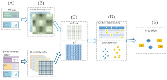 The flowchart of miRNA-EF interaction prediction. (A) Computing similarities of miRNA-miRNA and EF-EF, respectively. (B) Establishing similarity matrices of miRNA and EF, respectively. (C) Integrating similarity matrices of miRNA-miRNA and EF-EF by using similarity network fusion method, respectively. (D) Predicting miRNA-EF interactions by using multi-label learning and bi-random walk. (E) The final predicted results.