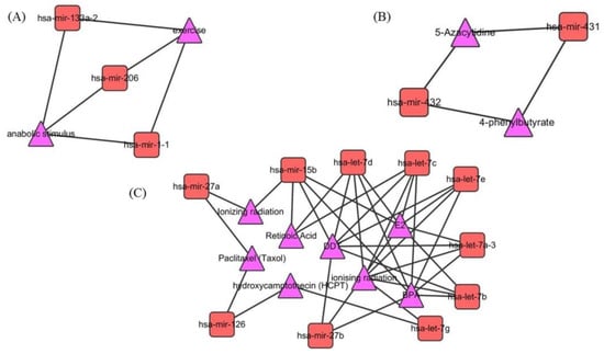 Three modules are obtained from miRNA-EF interaction network by utilizing ClusterViz. (A) The EFs (anabolic stimulus and exercise) are related with hsa-mir-133a-2, hsa-mir-206 and hsa-mir-1-1. (B) The EFs (5-Azacytidine and 4-phenylbutyrate) are associated with hsa-mir-431 and hsa-mir-432. (C) The EFs (DDT, E2, BPA and ionizing radiation) have associations with the let-7 family.