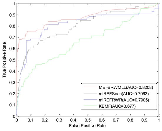 To demonstrate the effectiveness of our method, a comparison between our method and three state-of-the-art methods (miREFScan [20], miREFRWR [22] and KBMF [6]) is conducted. The parameters of these methods are specified as the default value. The 10-fold cross validation is utilized to evaluate the performance of different methods. The known miRNA-EF interactions are divided into 10 subsets. One subset is used as test set and the remaining nine subsets are treated as training set. Then, the true positive rates (TPR) and false positive rates (FPR) are calculated by using different classification thresholds. The receiver operating characteristics (ROC) curve is drawn based on the value of TPR and FPR and the area under the ROC curve (AUC) is calculated to measure the performance. The higher of AUC value, the better performance is. The experimental result is shown in Figure 4. It can be found that our method achieves an AUC of 0.8208 which is better than other two methods (miREFRWR: 0.7905, miREFScan: 0.7963 and KBMF: 0.677).