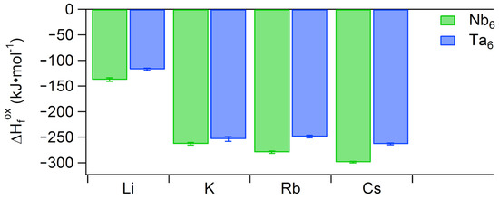 We previously conducted high-temperature oxide decomposition calorimetric studies on alkali (Li+, K+, Rb+, Cs+) salts of Nb [26]. Upon dropping pellets made from crystalline samples into molten sodium molybdate at 700 , we ascertained a trend of increasingly exothermic enthalpy of formation from oxides () with respect to alkali countercation size. To parallel this previous study, we performed measurements on the same alkali salts of Ta. Although the Na8[Ta6O19] salt can be synthesized, it was not studied because the analogous Nb salt is not readily obtained. Rather, Na7[HNb6O19] is the common form [27]. The measured is less exothermic for each alkali Ta6 analogue, compared to the Nb6 analogue (Figure 1). We rationalize this as mixing of Ta and O orbitals in Ta being poorer than the mixing between Nb and O in Nb [8,18], decreasing the thermodynamic stability of the Ta cluster in comparison to the Nb cluster. As with the observed trend for hexaniobate, the Li+ salt of Ta exhibits a far less exothermic (by more than a factor of two) than the larger alkali salts. This is explained by the structure of lithium hexaniobate [28,29]. The hexaniobate lattice contains adamantane-like Li-water clusters, which prevents extensive direct bonding between Li+ and Nb. A high-resolution single-crystal structure of Li–Ta has never been possible, due to poor crystal quality and perhaps disorder of the hydrated lithium in the lattice. We surmise that Li–Ta is not isostructural with the Li–Nb analogue (Li8Nb6O19·22H2O) due to the lack of a reported single-crystal structure for lithium hexatantalate [30,31]. However, Li is generally bonded to water in hydrated salt lattices, and this is reflected in its less exothermic formation enthalpy, compared to the salts of the heavier alkalis. Unlike Nb, the K+, Rb+, and Cs+ salts of Ta do not exhibit a strict trend of increasing (Figure 1). Instead, the three larger alkali salts are more similar in their . This suggests that Ta is slightly `less selective’ in its solid-state ion association than Nb.