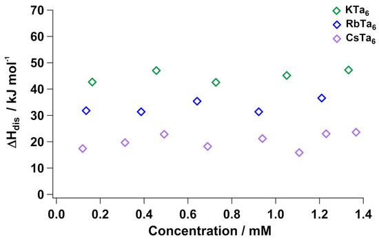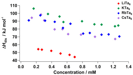 While high-temperature calorimetry provides information about the stability of the clusters and their association with lattice species, solution calorimetry elucidates hydration enthalpies of the ions upon dissolution, as well as their solid-state lattice interactions. Enthalpy of dissolution () at room temperature of the Nb salts in neat water showed that the Cs-salt has greater concentration dependence in its dissolution enthalpy compared to the other alkali salts. By extension, the degree of structural change became less extensive at higher concentrations, indicating that the Cs+ underwent maximum ion-pairing with Nb6, even at the low concentrations (<2 mM). Analogous measurements of Ta6 salts also showed concentration dependence for each alkali salt (Figure 2). Li+ again cannot be easily compared to the larger alkalis, due to its far more extensive coordination to water molecules in the solid state. This is reflected in its overall lower values of compared to the other three alkali salts, meaning it is not necessary to disrupt extensive bonding between the clusters and alkalis to dissolve them, which is an endothermic process. However, the steeper slope of the Cs–Ta trend was matched by the Rb+ salt, with K+ having a smaller slope. This indicates that rubidium and cesium undergo similar degrees of ion-pairing with Ta in solution, which is different from the observed Nb trend, in which the cesium salt clearly had the greatest dependence on concentration. Like the high-temperature calorimetry, this too indicates that Ta is `less selective’ in its ion association than Nb (in both solution and solid state). On the other hand, it has been noted that Nb is more basic than Ta, meaning it protonates upon dissolution in water, at the bridging oxos sites [32,33]. Since protonation is an endothermic process that is not equal between the Ta and Nb, it is difficult to compare the dissolution enthalpy with exact certainty.