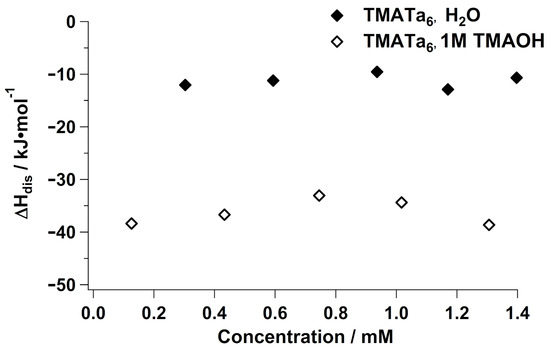 Finally, we compared the of the tetramethylammonium salt of Ta ([(CH3)4N]6H2O19·21H2O, TMA–Ta) in water and in 1 molar TMAOH to the previously measured Nb analogue (Figure 4). As with the analogous TMA–Nb study, does not have a concentration dependence in either solution environment due to the lack of ion association between TMA+ and Ta. However, is less exothermic for TMA–Ta (∼ ) than it is for TMA–Nb (∼ ) in water. As described above, this is because Ta is a weaker base than Nb [25], resulting in a lesser degree of deprotonation, consistent with fewer exothermic events occurring in solution. The difference in between TMA–Ta and TMA–Nb is greatly enhanced in 1M TMAOH (∼ and (∼ , respectively). This is due to the tendency for TMA–Nb to form oligomeric chains in neat water, whereas TMA–Ta typically forms dimers [24]. Thus, the vast difference in exothermic dissolution is further explained by the degree of hydrolysis of the respective assemblies—a far greater number of exothermic events occur in dissociating the Nb6 chains than in dissociating Ta dimers. The is nonetheless more exothermic for TMA–Ta in 1M TMAOH than it is in neat water due to the disassembly of these dimers.