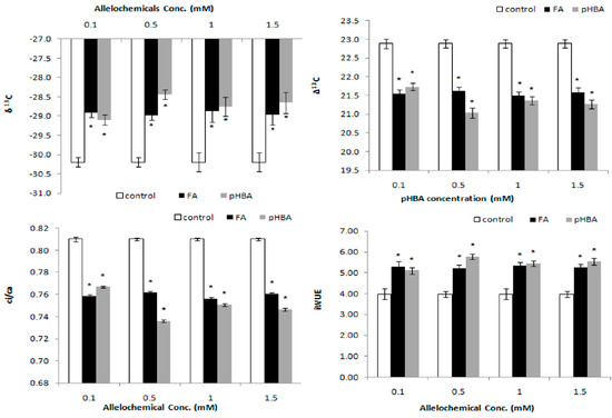 The effects of FA and pHBA on δ13C and Ci/Ca, varied at different levels of treatment (Figure 1). Under low allelochemical concentrations, higher N availability might stimulate CO2 carboxylation in RuBisCO. Ci/Ca decreased rapidly with higher concentration of FA and pHBA. However, iWUE increased all allelochemical concentrations. Compared to no allelochemical supply, iWUE was significantly higher at all allelochemical concentrations. The ratio of intercellular to ambient CO2 concentration in R. acetosa was decreased following treatment of both secondary metabolites and this effect was lethal at 0.5, 1.0 and 1.5 mM level (Figure 1).