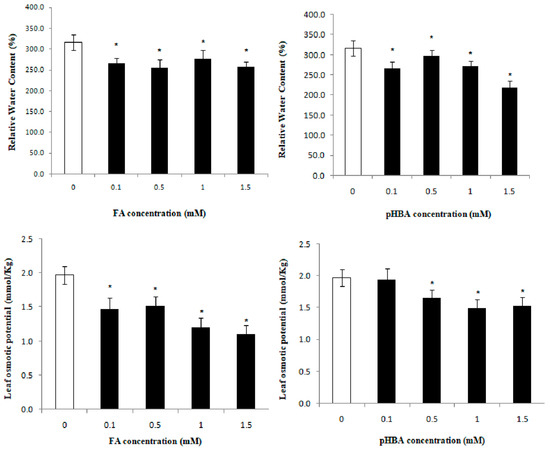 Leaf relative water content (%) and leaf osmotic potential (mmol/Kg) in leaves of Rumex acetosa L. one week after exposure to four concentrations (0.1, 0.5, 1.0, and 1.5 mM) of ferulic acid (FA) and p-hydroxybenzoic acid (pHBA) and control. Every column in each graph represents the mean (± S.E.) of three replicates. * Asterisks indicate significant differences at p ≤ 0.05 with respect to control.