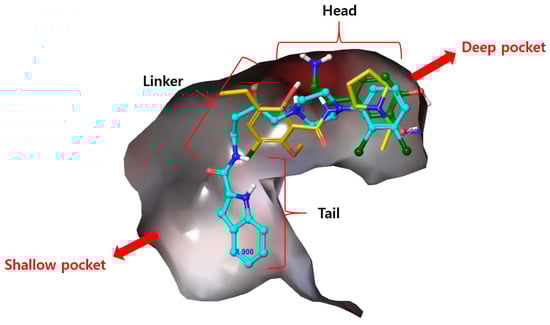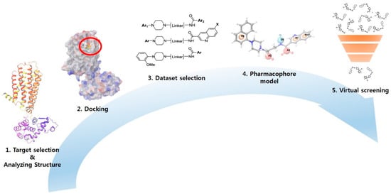 A summary of the hit selection workflow is summarized in Figure 2. Hit compounds identified by screening using two models were sorted by fitness score in descending order; then, they were filtered using the following drug-like criteria based on Lipinski’s rule: AlogP < 5; molecular refractivity of 4~130; nitrogen-containing; Molecular weight (MW) of 180~500 and preferably around 400; Polar surface area (PSA) < 90; Hydrogen bonding donor (HBD) < 5; and Hydrogen bonding acceptor (HBA) < 10 [27]. Filtered hits were processed through Ligprep for conversion to 3D, docked to 3PBL to investigate their interaction with the target protein, and filtered using the secondary criteria of a docking score < −7, a ligand efficiency < −0.3 [28], and a charge range from −1 to 1. Qikprop in Maestro is used to apply CNS-like property filtering criteria of QPlogBB > −0.523, BB > 0.3 [29,30,31], and CNS ≥ 1; the score value of −2 is CNS inactive, and the score value of 2 is CNS active [32].